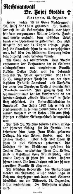 - ↑ Michael Gamper: Rede anläßlich der Gedenkfeier des 20. Todestages von Dr. Josef Noldin am 14. Dezember 1949. In: Dolomiten. Tagblatt der Südtiroler vom 15. Dezember 1949, S. 5 (Digitalisat).