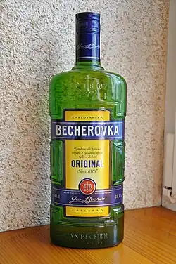 Der Likör, erstmals nach einer geheimgehaltenen Rezeptur von Josef Vitus Becher hergestellt, wurde seit 1807 „Englischbitter“, später „Karlsbader Becherbitter“ genannt. Joseph Becher starb am 27. Juli 1840 in Karlsbad Nr. 37 an Lungenlähmung[4]. 1841 übernahm Josef Bechers Sohn aus zweiter Ehe, Johann Becher, (* 5. April 1813[5]; † 1. April 1896, tschechisch Jan Becher) die Produktion. Dieser ließ 1867 den Fabrikationsbetrieb vergrößern, organisierte den stark ansteigenden Export des „Karlsbader Becherbitter“ und erhielt kurz vor seinem Tod im Jahr 1896 die Ernennung zum kaiserlich-königlichen Hoflieferanten.