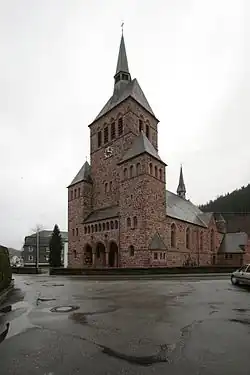 | Pfarrkirche St. Hubertus Der neuromanische Neubau der Pfarrkirche St. Hubertus wurde von 1912 bis 1913 errichtet. Der derbe Gewölbebau als Seitenschiff und der quadratische Westturm stammen von einer früheren Kirche. |