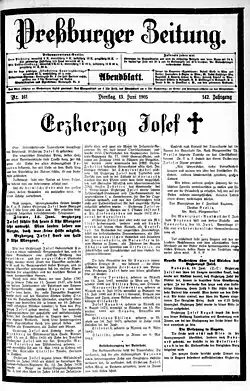 Die Preßburger Zeitung bringt die Todesnachricht auf der ersten Seite ihrer Abendausgabe vom 13. Juni 1905⚭ 1893 Prinzessin Auguste Maria Luise von Bayern (1875–1964)