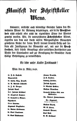 - ↑ Manifest der Schriftsteller Wiens. Aufruf der Schriftsteller Wiens zur Verwirklichung der Pressefreiheit; Wien, 15. März 1848, bei ÖNB