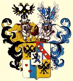 1773: Schild quadriert mit Mittelschild. Im silbernen Mittelschild ein rechts gekehrter, gekrönter, blauer Löwe. 1 und 4 in Gold ein golden gekrönter und bewehrter schwarzer Doppeladler, welcher auf der Brust, so wie auf jedem Flügel mit einem sechsstrahligen, goldenen Stern belegt ist. 2 von Blau und Silber der Länge nach geteilt mit einem roten, schrägrechten Balken, welcher mit drei untereinanderstehenden, silbernen Pilgrimsmuscheln, das Schloss oben, belegt ist, und 3 von Silber und Blau der Länge nach geteilt mit drei (2 und 1) roten Herzen, das untere auf der Teilungslinie des Feldes. Auf dem Schilde stehen zwei gekrönte Helme. Der rechte trägt den mit drei Sternen belegten Doppeladler des 1. und 4. Feldes und der linke einen offenen Adlersflug. Der rechte Flügel desselben ist von Silber und Blau der Länge nach geteilt und mit dem schrägrechten Balken und den Muscheln des 2. Feldes belegt, der linke aber von Silber und Blau der Länge nach geteilt und mit den drei roten Herzen des 3. Feldes belegt (nach Hefner ist der offene Flug auf dem linken Helme silbern). Die Helmdecken sind rechts schwarz und golden, links blau und silbern.[4][5]
