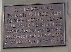 “HE LABOURED TO BRING FREEDOM TO THE NEGRO SLAVE THE VOTE TO BRITISH WORKMEN AND THE PROMISE OF PEACE TO A WAR-WORN WORLD”
