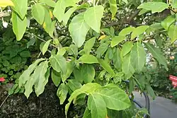 Die wechselständigen und kurz gestielten Laubblätter sind elliptisch bis eiförmig und bis zu 20 cm lang. Die spitzen bis stumpfen und ganzrandigen Blätter sind ledrig, oberseits fast kahl und unterseits fein behaart, verkahlend. Die Blattstiele sind rinnig und kahl bis dicht behaart.