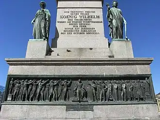 - „Dem treuesten Freunde seines Volkes, König Wilhelm dem Vielgeliebten, widmen die Stände Württembergs dieses Denkmal zur Feier seines 25jährigen Regierungsjubiläums, den 30. Oktober 1841.“