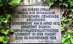 Der Anteil der Juden an der Gesamtbevölkerung Solingens betrug stets weniger als ein Prozent. 1804 waren es 32 jüdische Einwohner, 1905 wurde mit 328 Personen ein Höchststand erreicht. 1933 waren 219 Juden in Solingen sesshaft, von denen 1941 noch 15 dort erfasst waren.[3] Die wenigen verbliebenen jüdischen Menschen wurden Ende 1941 ins Ghetto Lodz oder 1942 nach Theresienstadt deportiert. 64 Solinger Juden sind als Opfer der Shoa namentlich bekannt, darunter auch der Unternehmer Alexander Coppel und seine Angehörigen.[8][3] Die Namen der Opfer sind auf einer Gedenktafel am Hochbunker Malteserstraße aufgeführt. Mitorganisator der reichsweiten „Endlösung der Judenfrage“ war der in Solingen geborene Adolf Eichmann.