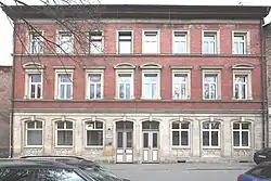 Die beiden mit Segmentbogenrahmen gleich gestalteten Eingänge befinden sich in der Mitte des Erdgeschosses, flankiert jeweils von drei Fenstern mit ebenfalls segmentbogigen Stürzen. Bei den in acht Achsen angeordneten Fenstern des Obergeschosses wechseln gerade und segmentbogige Stürze, im zweiten Obergeschoss gibt es nur gerade Stürze.