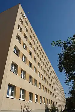 Der Gebäudekomplex wurde von 1974 bis 1975 nach Entwürfen der Architekten Bruno Kandler und Herbert Löschau (Städtebau) errichtet. Es ist ein siebengeschossiger Baukörper mit zwei an der Seite befindlichen, hervortretenden Risaliten auf seiner Nordseite. Die Fassade ist 34 Fensterachsen lang. Jeweils zehn Fensterachsen werden sowohl an dem linken Seitenrisalit, wie am rechten Seitenrisalit mit horizontalen Fensterbändern zusammengefasst. Die in der Mitte befindlichen 14 Fensterachsen werden nicht durch Fensterbänder eingebunden und bilden eine Lochfassade. Das Gebäude verfügte über 388 Internatsplätze und wurde in einer 5-Megapond-Plattenbauweise mit Keramikmosaik-Oberfläche erbaut.[3]