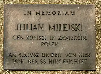 Der Gedenkstein mit der Gedenktafel wurde am 4. Mai 2008, genau 66 Jahre nach der Hinrichtung Milejskis, feierlich enthüllt. Das Mahnmal, das an das Schicksal von Julian Milejski erinnert, wird seitdem von Steller Bürgern und dem Arbeitskreis betreut.[6][7]