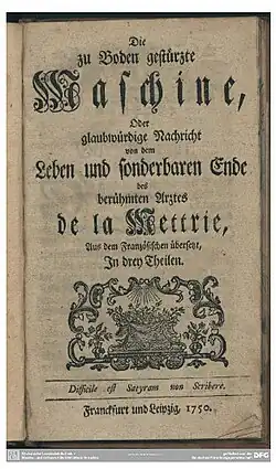 - Die zu Boden gestürzte Maschine, Oder glaubwürdige Nachricht von dem Leben und sonderbaren Ende des berühmten Arztes de La Mettrie, Aus dem Französischen übersetzt in drey Theilen. Frankfurt und Leipzig, 1750 (SLUB – Sächsische Landesbibliothek – Staats- und Universitätsbibliothek Dresden).