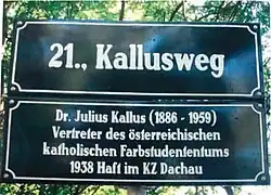 Auf dem Schild wird er als „Vertreter des österreichischen katholischen Farbenstudententums“ genannt, welcher 1938 im KZ Dachau in Haft kam.[14]
