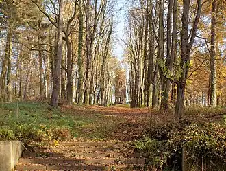 Ein Mischwald, in welchem geschwungene Fußwege verlaufen, umschließt eine rechteckige Wiese von 0,5 Hektar. Am oberen Ende des Parks steht der Bismarckturm, ein 16 Meter hoher Aussichtsturm. Von ihm führt eine gerade Allee nach Westen zu einem Steinrondell, das ein Flatterecho aufweist.[2] Die Allee dient zugleich als Sichtachse zur Ruine des Klosters Nimbschen auf der gegenüberliegenden Flussseite. Im südlichen Teil lädt ein Springbrunnen mit Bänken zur Rast ein.