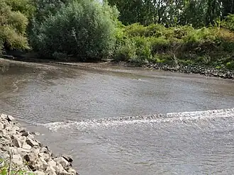 Mündung des Käsbachs in den Kostheimer Mainhafen. Der Käsbach hat Unmengen ganz feiner schlickartiger Sedimente im Hafenbecken abgelagert, die durch stetige, gezeitenartige Schwankungen des Wasserspiegels weiter getragen werden und den Wasserstand ganz flach auslaufen lassen. Im Bild ist eine auflaufende Flutung zu sehen. Die Schwankungen werden durch den an der Mündung des Hafenbeckens vorbeifahrenden Schiffsverkehr verursacht. | ||