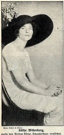 Die gebürtige Danzigerin suchte schon als junges Mädchen den Weg auf die Bühne. Ihr erstes Festengagement führte sie mit 17 Jahren an das Stadttheater im nahe gelegenen Bromberg. In der darauf folgenden Spielzeit (1908/09) trat Käthe Wittenberg am Posenschen Provinzialtheater auf, die Saison 1909/10 brachte die junge Künstlerin an das Zürcher Stadttheater. 1911 erreichte Käthe Wittenberg Berlin, wo sie einem Ruf an das Friedrich-Wilhelmstädtische Schauspielhaus folgte. In der darauffolgenden Spielzeit (1912/13) schloss sie sich dem Ensemble der Königlichen Schauspiele an, wo sie im Rollenfach der „jugendlichen Heldin“ reüssierte. Zu dieser Zeit meldete sich auch erstmals der (damals noch stumme) Film bei ihr und gab ihr in den Folgejahren zentrale Rollen, etwa als die Sonja Czernowska in dem gleichnamigen Melodram, die Ehefrau Albert Bassermanns in dem Drama Dr. Schotte, die Helene von Dönniges in dem Arbeiterführer-Porträt Ferdinand Lassalle – Des Volkstribunen Glück und Ende und die ehemalige Königin Vasthi in dem Monumentalfilm Das Buch Esther, eine darstellerische Leistung, die von der Kritik gelobt wurde[1]. Wittenberg spielte vor der Kamera aber auch tragende Nebenrollen in weit weniger bedeutenden Filmen, etwa an der Seite von Mia May und deren Tochter Eva. Bereits kurz nach Ende des Ersten Weltkriegs beendete Käthe Wittenberg ihre Arbeit vor der Kamera und konzentrierte sich wieder ganz auf die Bühnentätigkeit.