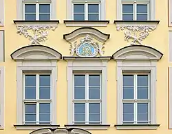 Alle Fenster des dreiachsigen Mittelrisalits der Schauseite sind mit profilierten Gewänden und verschiedenen Verdachungsgiebeln geschmückt. Im ersten Stock wird ein Schweifgiebel von zwei Segmentbögen umrahmt und enthält eine Kartusche mit den Initialen des Bauherrn. Im zweiten Obergeschoss befinden sich seitlich Dreiecksgiebel, die durch feines Rocaillewerk mit den Fenstern verbunden werden. Das Mittelfenster wird von einem gesprengten Segmentgiebel überdacht, in dessen Mitte sich eine reich geschmückte Rokokokartusche mit Blüten und Frauenmaske befindet. Die Fenster des dritten Stocks sind gerade verdacht, im vierten Stock findet sich weiterer Schmuck in Form von Muscheln und Blütenketten.