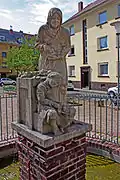| Der Barbarabrunnen in Köln-Neuehrenfeld wurde um 1927/28 in der Ennenstraße errichtet und ist mit „H. Geier“ signiert. Die Skulptur des Brunnenstocks aus Muschelkalk erhebt sich auf einem gemauerten Backsteinsockel, dessen Wasserspeier das ihn umgebende Becken versorgen. Die von einem Gitter eingefasste Anlage erinnert an einen Brauch, wonach am Vorabend zum Fest der heiligen Barbara, diese den in der Nacht schlafenden Kindern die Schuhe mit Äpfeln und Nüssen füllte, wenn sie ihr Schuhwerk geputzt hatten. Für den Brunnen übernahm die Karnevalsgesellschaft „Barbar Anniter“ die Patenschaft.[17] | |