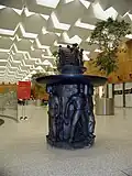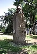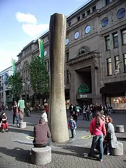 | Der Barthonia-Brunnen an der Venloer Straße 251 in Ehrenfeld trägt den Namen des Investors „Barth“, der das ehemalige „Mülhens-Gelände“ (4711) zu Büro-, Geschäfts- und Gewerbezwecken umwandelte. Die etwa 2,60 m hohe, sich nach oben verjüngende Skulptur wurde von dem Kölner Künstler Willi Neffgen entworfen. Sie ist ohne die unten umlaufende Bezeichnung „Barthonia-Forum“ mit weiteren 530 Schriftzeichen bestückt, welche aus 14 vergangenen oder bestehenden Kultur- und Sprachräumen entnommenen wurden. Die verwendeten Zeichen variieren in Größe, Stärke und Form, sind manchmal seitenverkehrt angebracht oder stehen Kopf. Die originelle Skulptur regt zum Sinnieren an und ist eine Bereicherung des Stadtbildes.[33] Im Rahmen der Neugestaltung der Platzfläche 2019/2022 wurde der Brunnen abgebaut.[34] | |