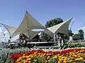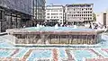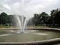 Die zwischen dem Haupteingang und dem Hauptgebäude der Flora platzierte Springbrunnenanlage ist mit einem Fontänenkranz ausgestattet. Die Anlage entstand ursprünglich 1862 nach Plänen von Peter Joseph Lenné und ist von monumentaler Größe.[17] | |