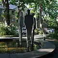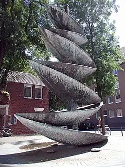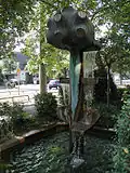 | Futuristisch anmutender Brunnen in Lindenthal an der Dürener Straße 393. Den Eingangsbereich eines Bürohauses ziert ein aus Bronze gestalteter Licht- und Wasserbrunnen. Es ist ein Entwurf von Heribert Callen aus dem Jahr 1980.[17] Im Mai 2022 wurde die Bronzeskulptur von dem Firmengelände gestohlen, wo sie zur Restaurierung lag.[35] | |