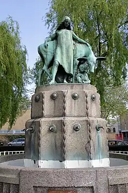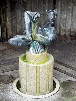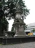 | Der Stadtbrunnen Mülheims, die „Mülheimia“, steht an der Straße Mülheimer Freiheit, Ecke Krahnenstraße. Die Aufstellung eines Brunnens wurde auf Initiative des letzten Bürgermeisters der Stadt Mülheimer an Rhein, Bernhard Clostermann, angeregt und 1884 nach einem Entwurf des Kölner Bildhauers Wilhelm Albermann verwirklicht. Die Kosten des Brunnens, der bis zum Jahr 1913 die einzige derartige Anlage Mülheims blieb, beliefen sich damals auf 9.500 Mark.[36] 1965 wurden durch Eduard Schmitz eine Instandsetzung mit Ergänzungsarbeiten am Brunnenbecken durchgeführt. | |