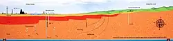 1931 wurde unter Oberbürgermeister Konrad Adenauer auf dem Messegelände der 251,40 Meter tiefe Messebrunnen I gebohrt. Aus diesem konnte dann ein mineralhaltiges Wasser gefördert werden. Das Mineralwasser wurde in einer Tiefe von 235 m erschlossen.[19] Die Bohrung des Messebrunnens II blieb jedoch in ihrer Ergiebigkeit bedeutungslos. 1932 wurden beide Quellen als gemeinnützig im Sinne des §1 des Quellschutzgesetzes vom 14. Mai 1908 erklärt, ein Heilquellenschutzgebiet wurde entgegen den Vorschlägen der Gutachter jedoch nicht errichtet.[20] Aufgrund von Korrosionsschäden der Verrohrung beider Brunnen musste man im Jahr 1959 eine umfassende Sanierung der Bohrlöcher vornehmen, ohne jedoch bei der Erhöhung der Förderleistung entsprechende Erfolge zu erzielen. Daraufhin entschloss man sich zu einer Neubohrung, 50 m vom Messebrunnen I entfernt. Die dann in den Jahren 1961 und 1962 mit besserer Technik erreichten 364 Meter Tiefe des Messebrunnens III brachte dann bis zu 200 m³/h thermales kohlensäurehaltiges Natrium-Chlorid-Wasser. Auch mit einer schon verausgabten Summe von einer halben Million DM Kosten war das Ziel, auf ein Grundwasserreservoir mit höheren Wassertemperaturen zu stoßen, nicht erreicht worden, sodass der Rat der Stadt die Arbeiten zur Erschließung einer Thermalquelle einstellen ließ. Die Stadtverwaltung ließ jedoch, zunächst ohne den Rat zu informieren, später weiterarbeiten. Um 1967 wurde dann unter großen technischen Anstrengungen der Messebrunnen IV mit einer Tiefe von 1027 Meter erfolgreich abgeteuft. Um den Zufluss von kaltem Wasser aus dem oberen Partien der Bohrung zu unterbinden, wurde das Bohrloch bis in eine Teufe von 724 m mit einer Stahlverrohrung abgedichtet. Aus der Bohrung IV wurde nun eine Natrium-Chlorid-Therme mit einer Temperatur von 28,5 °C gefördert. Mit diesem im Vergleich zu anderen deutschen Thermalbädern (Aachen 74 °C, Wiesbaden 66 °C.) eher mäßigen Wert wurden aber die Mindestanforderungen an Thermalwasser (Temperatur > 20 °C) erfüllt. Das Thermalwasser ist an devonische Kalk- und Dolomitsteine gebunden, die im Bergischen Land Niederschlagswässer aufnehmen. Das versickernde Wasser zirkuliert entsprechend dem hydraulischen Gefälle in Richtung Rhein, erwärmt sich entsprechend der geothermischen Tiefenstufe und nimmt dabei gelöste Mineralien und freies Kohlenstoffdioxid (bis 2000 g/l) auf.