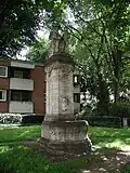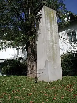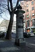Als Siemens Pumpe bezeichneter Brunnenpfeiler an der Dagobertstraße Ecke Am Krahnenhof. Die vordem gebauten Schöpfbrunnen wurden ab der Mitte des 18. Jahrhunderts nach und nach durch Pumpen ersetzt. Auch der hier gezeigte Brunnen entstammt dieser Zeit, wurde jedoch an der Dagobertstraße neu aufgestellt.[24] |