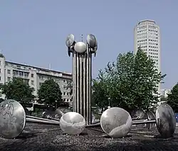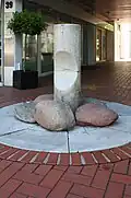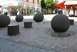 | Kugelbrunnen und Sitzblöcke in der Fußgängerzone der Bahnhofstraße Köln-Porz. Die als Wasserspiel konzipierte Anlage war ein Entwurf von Gottfried Kühn des Jahres 1974, ist jedoch nicht mehr in Funktion.[17] Kühn erhielt den Kölner Architekturpreis (1975), mit dem in seiner Person erstmals ein Gartenarchitekt ausgezeichnet wurde. | |