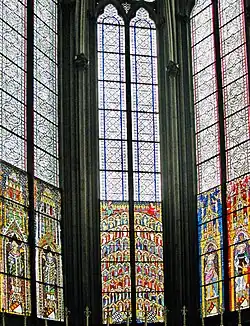 | Cäcilien-Glasfenster | Sakramentskapelle | Zwei Fenster enthalten je 8 Glasgemälde. Teil der ursprünglich 120 Szenen umfassenden Glasgemälde aus dem Kreuzgang von St. Cäcilien (heute Museum Schnütgen). Szenen aus dem Leben Jesu.[83] | 1460–1470 | Meister der Kölner Malerschule in der Nachfolge Stefan Lochners. | |