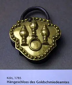 Zu den sich immer stärker etablierenden Zünften gehörten auch die Goldschmiede, die in der Rangfolge an vorderer Stelle standen und im Verbundbrief von 1395 an vierter Stelle angeführt wurden. Nach der Verabschiedung dieses „Grundgesetzes“ waren es nur noch wenige Jahre, bis die „goltsleigere“ genannten Goldschmiede (Gaffelhaus „Zum goldenen Horn“, 1401 bis zum Ende der reichsstädtischen Zeit, Unter Goldschmied 1),[9] als Hersteller von Blattgold und Goldschmuck ihre jüdischen Konkurrenten nicht mehr zu fürchten hatten.