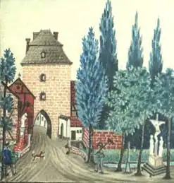 Zu Beginn des 14. Jahrhunderts wurde das Kölner Tor erbaut. Es erhielt diesen Namen, weil durch seine Pforte die Fernhandelsstraße nach Köln führte. Ihm war zur Erft hin ein Vortor mit Zwingmauern vorgelagert. Das Kölner Tor befand sich im Besitz der Stadt und musste auf Kosten der Bürger unterhalten werden. Die Stadt Bergheim besaß im Mittelalter und in der Frühen Neuzeit kein Rathaus. Deshalb richteten die Bergheimer Bürgermeister im 19. Jahrhundert im Kölner Tor ein „Geschäftsbüro“ ein. Hier wurde wohl auch das Archiv aufbewahrt.[1]