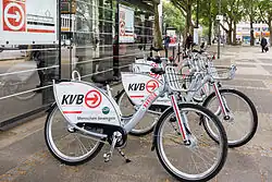 Am 8. Mai 2015 haben die Kölner Verkehrs-Betriebe zusammen mit dem Kooperationspartner nextbike das Leihradangebot KVB-Rad gestartet. Im linksrheinischen Stadtgebiet innerhalb des Militärrings, sowie rechtsrheinisch von Höhenhaus über Höhenberg bis Poll, stehen 1460 Fahrräder und zehn Pedelecs (Elektrofahrrad) zur Verfügung; sie können am Straßenrand entliehen und im Geschäftsgebiet zurückgegeben werden.[28] Für Abo-Kunden und Studenten ist die Nutzung von 30 Minuten pro Fahrt kostenfrei.