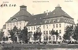 Das König-Georg-Gymnasium in Dresden wurde als erste humanistische Reformschule Sachsens am 21. April 1903 eröffnet, benannt nach dem 1902 bis 1904 regierenden König Georg. Am Fiedlerplatz wurde 1905 mit einem Neubau begonnen, den Stadtbaurat Hans Erlwein errichtete. Ausmalungen stammten vom Zunft-Mitglied Otto Gussmann, darunter das 1910 vollendete Deckengemälde im Festsaal. Neben dem Schulgebäude entstanden zwei Turnhallen sowie ein Waldgarten. Am 12. Oktober 1907 wurde das Gebäude eingeweiht.