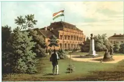 Mit dem Ausgleich von 1867 wurde das Parlament, bis dahin Landtag genannt, zum Reichstag (ung. Országgyűlés) aufgewertet und war nun zuständig für die Belange der Länder der Heiligen Ungarischen Stephanskrone.[2] Der Reichstag bestand aus zwei Kammern, dem Unterhaus, genannt Repräsentantenhaus (ung. Képviselőház), und dem Oberhaus, genannt Magnatenhaus (ung. Főrendiház). Die 413 Mitglieder des Repräsentantenhauses wurden gewählt. Die meisten der 360 Mitglieder des Magnatenhauses waren adelig oder kirchliche Würdenträger.[47]