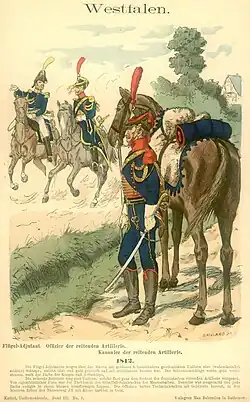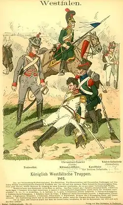 Westphälische Divisionen schlugen 1809 in Spanien und in Deutschland (u. a. Dörnberg-Aufstand) Aufstände nieder. 1812 wurde die ganze westphälische Armee mobil gemacht und brach im Frühjahr nach Polen auf, um dort das achte Korps der Grande Armée zu bilden, welches der König selbst und unter ihm der General Vandamme, später General Junot befehligte. Beim Russlandfeldzug 1812 kämpften 28.000 Westphalen; weniger als 1000 kehrten zurück.[20]