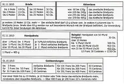 - Pakettaxe, je 4 Meilen und 1 Pfund (485 Gramm) 3 Centimes, Für Lebensmittel und Sachen ohne Wert nur 2 Centimes, mindestens aber doppeltes Briefporto.