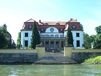 Als Folge der Säkularisation erwarb der Eltviller Handelskaufmann Johann Maria Kertell die Aue, die sodann Kertellaue genannt wurde.[3][4] Nach seinem Tode war sie von 1831 bis 1851 im Eigentum der Familie Langwerth von Simmern. Nächster Eigentümer war Salomon Marix, ein Seidenwarenhändler aus Lyon, der sich im gleichen Jahr in Eltville niedergelassen hatte.[3] Er ließ 1853 ein erstes Herrenhaus, das sogenannte Krimschlösschen auf der Insel errichten. Nach ihrer Hochzeit bewohnte Marix’ Tochter Olga die von ihrem Vater geerbte Insel, die daraufhin im Volksmund „Olga-Insel“ genannt wurde. 1888 erwarb Freiherr Carl Ferdinand von Stumm-Halberg die Insel, die nach dessen Tod 1901 an seine Tochter Berta von Lucius (1876–1949)[5] überging. Sie ließ das alte Herrenhaus niederreißen und 1904–1909 die heutige Villa nach Plänen des Architekten Wilhelm Kreis erbauen.[6] 1912 heiratete Berta von Lucius den Rittmeister Graf Adalbert von Francken-Sierstorpff (1856–1922). Als dieser am 27. Mai 1922 starb, ließ ihn seine Frau in einem Mausoleum im Osten der Insel beisetzen.[7] Im Eigentum dieser Familie blieb die Insel bis 1955 und ist seitdem noch mehrmals in andere Hände übergegangen. Heute befindet sich die Insel im Eigentum der Familie Mayer, welcher auch die Karl Mayer Textilmaschinenfabrik in Obertshausen gehört.[8]