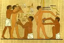 Beschneidung erwachsener Männer, Zeichnung eines Grabreliefs, Sakkara, 6. Dynastie, Ägypten, 2300 v. Chr.