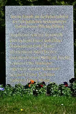 Am 23. Juni 1914[9] fand in der Friedhofskapelle von Fischamend eine Trauerfeier statt, an der unter anderem der Erste Obersthofmeister des Kaisers, Alfred von Montenuovo, sowie der Kommandant der Luftschifferabteilung, Emil Uzelac, teilnahmen.[9] Danach wurden die Opfer nach Wien überführt, wo sie am darauffolgenden Tag auf dem Wiener Zentralfriedhof beigesetzt wurden. Kaiser Franz Joseph I. wurde dabei von seinem Generaladjutanten Eduard von Paar vertreten, ferner war Erzherzog Peter Ferdinand anwesend.[10] Teilnehmer eines zu diesem Zeitpunkt auf dem Flugfeld Aspern stattfindenden internationalen Aviatikermeetings überflogen während des Begräbnisses in mit schwarzen Fahnen geschmückten Maschinen den Friedhof und warfen Blumen ab.[11] Das gemeinsame Ehrengrab[10] befindet sich in Gruppe 0, Reihe F, Nummer 1.