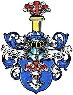 Blasonierung: In Blau ein silberner Helm abwechselnd mit vier silbernen und drei roten Straußenfedern besteckt. Auf dem blau-silbern bewulsteten Helm eine goldene Säule, oben mit den sieben Federn besteckt. Die Helmdecken sind blau-silbern.[6]