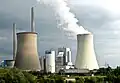 Ventilatorkühltürme (links, Höhe 34 Meter) und Naturzugkühlturm (rechts, Höhe 122 Meter) -