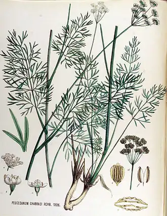 - ↑ K. Spalik, J.-P. Reduron, S. R. Downie: The phylogenetic position of Peucedanum sensu lato and allied genera and their placement in tribe Selineae (Apiaceae, subfamily Apioideae). In: Plant Systematics and Evolution, Volume 243, 2004, S. 189–210 doi:10.1007/s00606-003-0066-2
