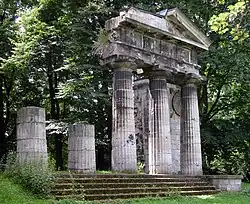 In der zweiten Hälfte des 18. Jahrhunderts wandte man sich auch im deutschsprachigen Raum ab vom nun als langweilig erachteten, rationalen Barockpark hin zum emotionalen Landschaftspark. Mit der Einführung freier Gartengestaltung wurden nicht nur „dramatische“ Elemente wie künstliche Grotten, Wasserfälle und Teufelsbrücken errichtet, sondern auch altertümliche Bauwerke (Burgen, Türme, Tempel, auch Aquädukte) in unterschiedlichen Stadien des Verfalls (nach)gebaut. Hierdurch sollte eine malerische Wirkung sowie eine Landschaftsstimmung erzeugt werden.[1] Sie sind typisch für das Zeitalter der Romantik.