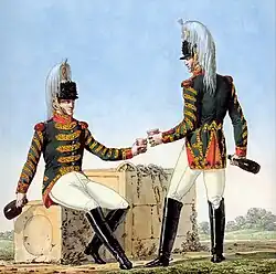 1804 ersetzte der charakteristische Helm den Hut. Die Glocke des Helmes war aus Stahl, Bügel und Schuppenketten aus Messing, der Turban aus schwarzem Fell und der Schweif aus schwarzem Rosshaar. Da der Helm jeweils vom Regiment selbst beschafft wurde, variierten diese zunächst von Regiment zu Regiment in Details. Die Offiziersmodelle hoben sich durch eine bessere Verarbeitung ab, insbesondere waren die Messingteile vergoldet.