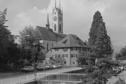 Reformierte Kirche Küsnacht, links das Hauptgebäude der Kantonsschule