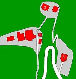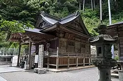 Man betritt die Tempelanlage durch das Tempeltor (山門, Sammon), das hier als Niō-Tor (仁王門) ausgeführt ist. Man steigt weiter hoch, bis man zum Mönchsbereich des Tempels gelangt. Beim Durchqueren dieses schmalen Bereichs sieht man den Glockenturm (鐘楼, Shōrō; 1) auf der rechten Seite, bevor es eine lange Treppe hinauf zur kleinen Haupthalle (本堂, Hondō; 2) geht. Auf einer eigenen Ebene befindet sich die Halle, die dem Tempelgründer gewidmet ist, die Daichidō (大師堂; 3).