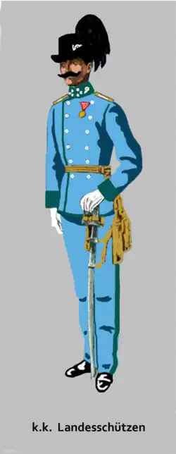 Die k.k. Landwehr bestand von 1869 bis 1918 in der cisleithanischen Reichshälfte als Pendant zur k.u. Landwehr in der transleithanischen Reichshälfte. Die Sonderstellung Tirols und Vorarlbergs in der Landesverteidigung wurde im Dezember 1870 mit Verabschiedung des Landesverteidigungsgesetzes für Tirol und Vorarlberg durch den Tiroler Landtag an das österreichische Landwehrgesetz von 1869 angepasst.[2][3] Daraufhin wurden im Jahre 1871 in Tirol neun und in Vorarlberg ein Infanterie-Bataillon der Landwehr errichtet, denen man aus historischen Gründen (in Anlehnung an die in Tirol seit dem 15. und 16. Jahrhundert bestehenden Schützengilden und -kompanien) den Namen Landesschützen gab. Neben den Infanterie-Einheiten wurde 1871 mit den „Reitenden Tiroler Kaiserschützen“ auch eine berittene Abteilung aufgestellt.