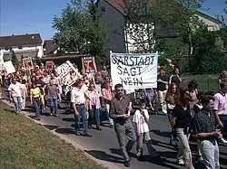 Im Oktober 2001 zogen etwa 250 Demonstranten mit Spruchbändern durch die Fußgängerzone von Schweinfurt. Im Mai 2003 kam es zu einer großen Protestaktion mit etwa 1000 Teilnehmern. Der Marsch der Demonstranten durch die Gemeinde Grafenrheinfeld wurde teilweise von Anwohnern flankiert, lief insgesamt friedlich ab und machte nur geringen polizeilichen Einsatz notwendig.[52]