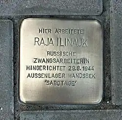 Aufgrund von schweren Misshandlungen starben während des Lagerbestehens mehrere weibliche KZ-Häftlinge und zwei Frauen wurden „auf der Flucht erschossen“. Die Russin Raja Ilinauk wurde, nachdem sie eine Gussform fallen ließ, wegen „Sabotage“ am 29. August 1944 im Lagerbereich gehängt.[2] Für Raja Ilinauk wurde in der Ahrensburger Straße 161 vor dem KZ-Außenlager ein Stolperstein verlegt und in Hamburg-Jenfeld eine Straße – Raja-Ilinauk-Straße – nach ihr benannt.[3] An diesem Tag findet heute jedes Jahr eine Gedenkveranstaltung statt, die von der Bezirksversammlung Hamburg-Wandsbek und von Bezirkspolitikern unterstützt wird.