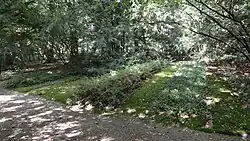 Der KZ-Friedhof besteht aus Reihengräbern. Die sterblichen Überreste „der Toten wurden in Doppelreihen mit einem Abstand von 20 cm an den Längsseiten und 10 – 20 cm an den Stirnseiten“ begraben.[4] Diese Massengräber sind mittels niedrig gehaltenen Sträuchern markiert.[5] Bebildert folgt der Überblick über die Bauwerke, Denkmäler und Gedenksteine des KZ-Friedhofes: