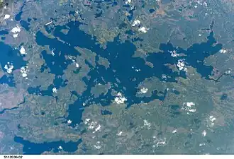 | Kabinakagami Lake vom All aus gesehen während der NASA-Mission STS-112 | ||